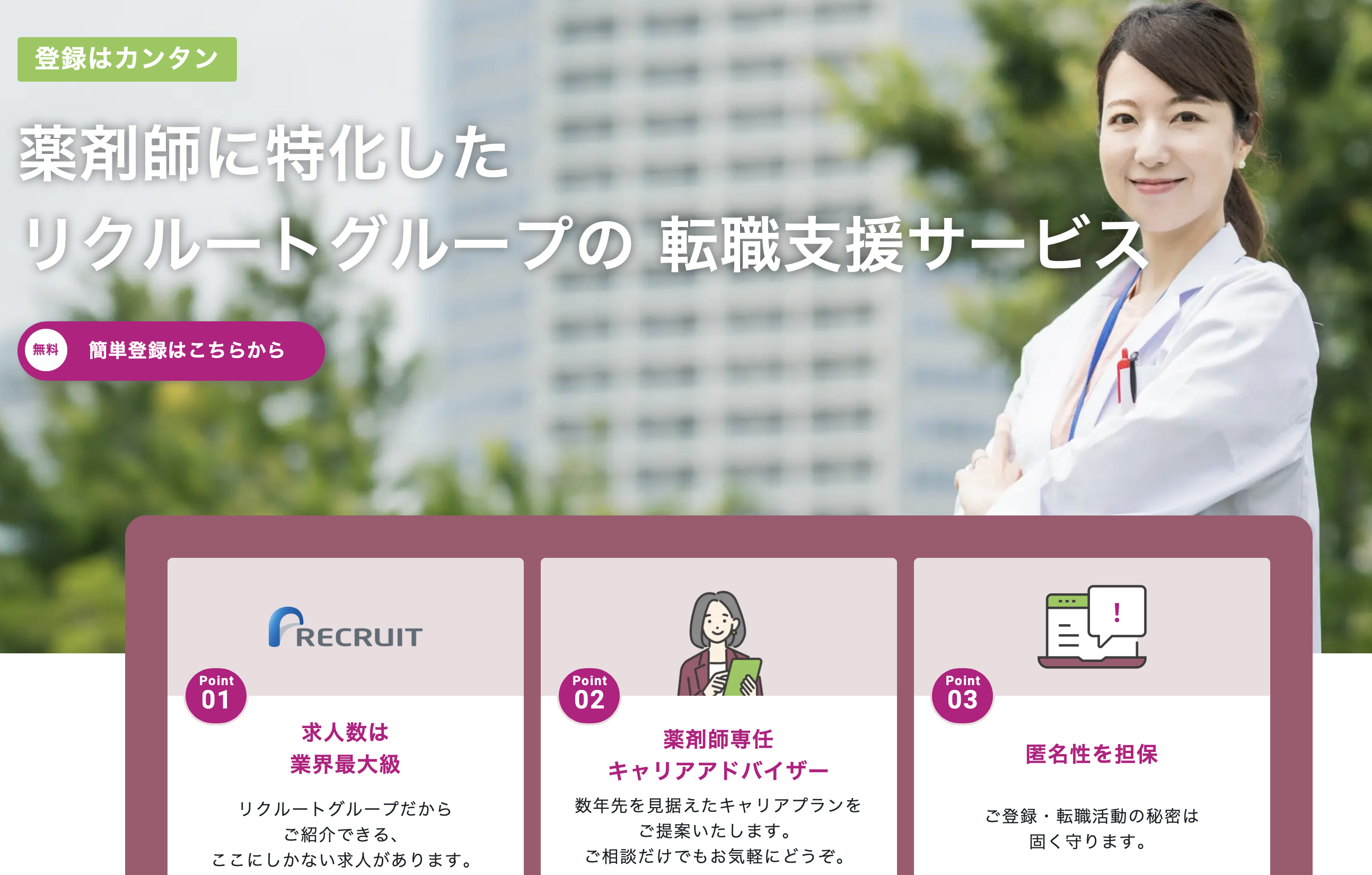 リクナビ薬剤師は、大手人材会社リクルートが運営している、薬剤師特化型の転職サイトです。